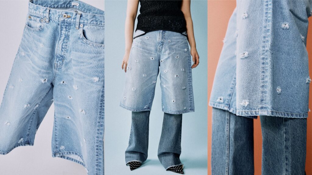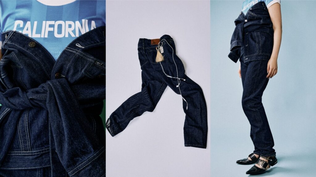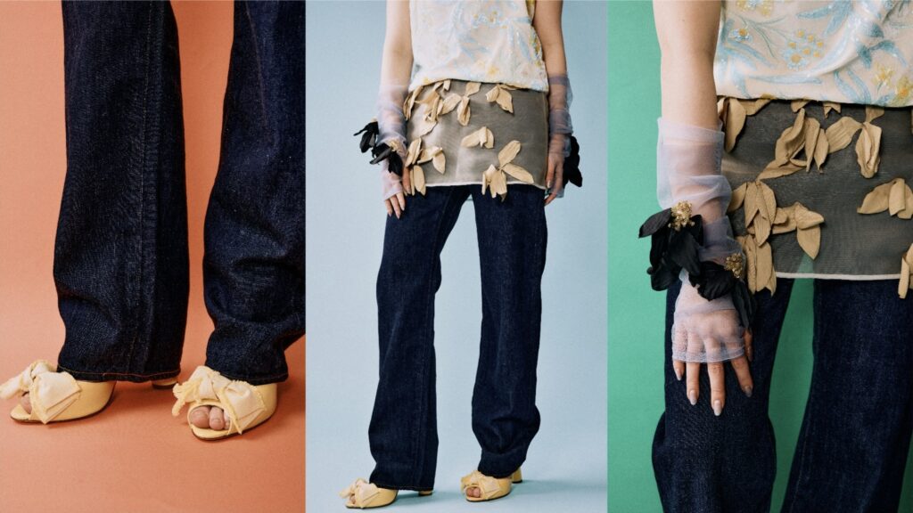 濃いブルーのストレートデニムに、スパンコールや花びらの装飾。楽天的なアイテム同士のハレーションを、あえてポジティブに重ねる。リボン付きヒールを合わせれば、春を歓迎する華やかなムードに。