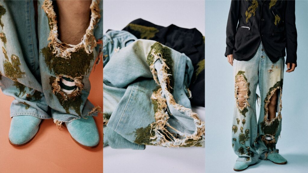 「コケシリーズ」のジャケットやデニムは、その名の通り長い年月を経て苔が生えたような加工を施した、これまでにない新鮮なアイテム。存在感のあるアイテムだからこそ、足元はスリッパで抜け感を。