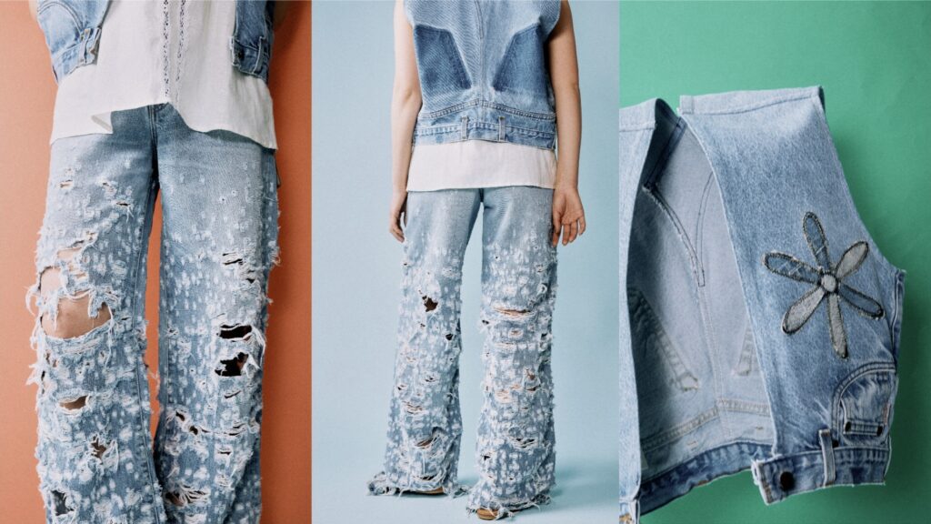 大胆なダメージ加工で、濃淡の表情が模様のように浮かぶデニム。コットンキャミソールの上に、デニムパンツをリメイクしたベストをレイヤード。胸元には小さな花を。ポジティブなエネルギーをまとって、軽やかに進みたい。