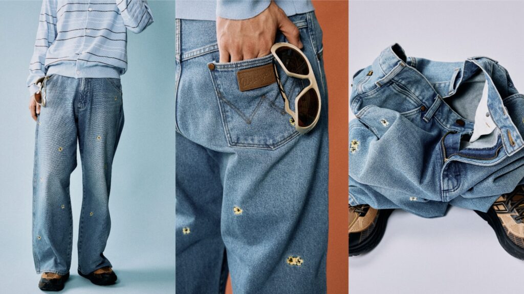 テックなサングラスやスニーカーで引き締めつつ、全体は淡いトーンのグラデーション。デニムに咲く小さな黄色い花が、さりげなく春のムードを運んでくる。親しみやすさと洒落感、その絶妙なバランスが心地いい。