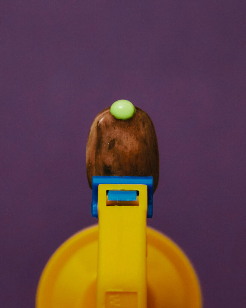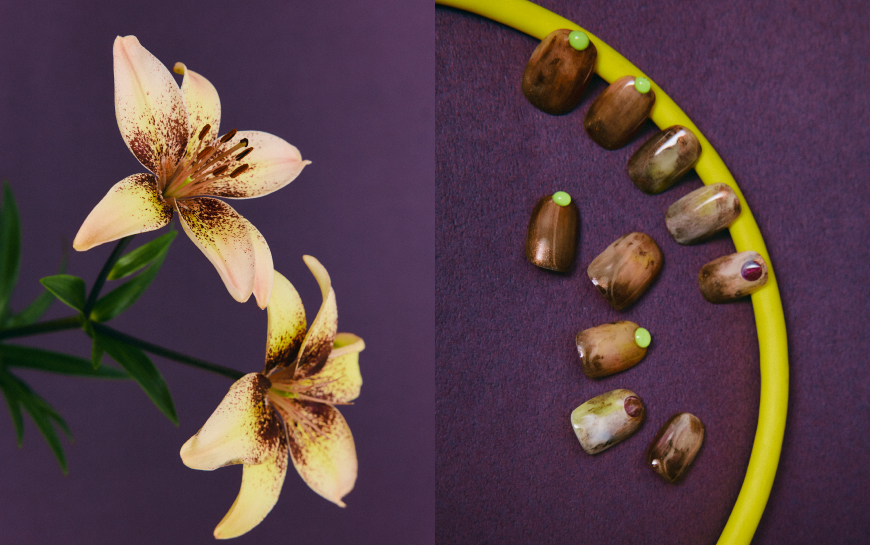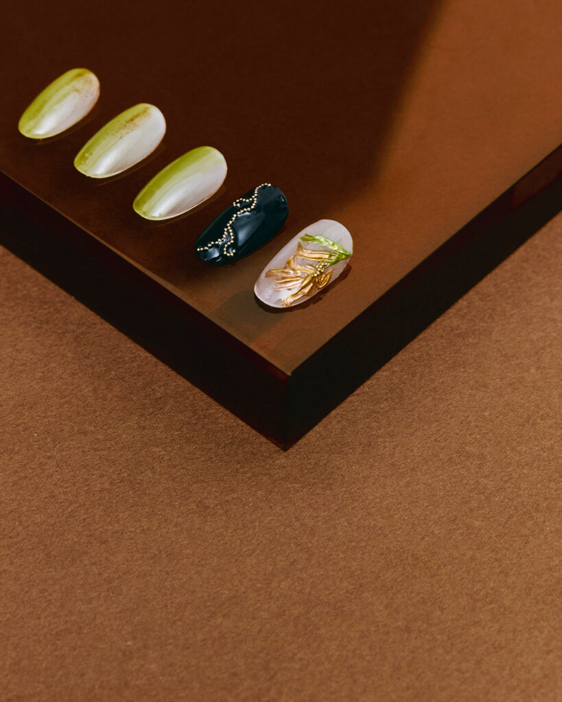 A1. バーガンディがちりばめられた独特の色合いを主役に、あえて明るめの蛍光グリーンを差し色にして抜け感を演出。指先の丸のサイズもいびつに、上品さの奥にふっとクセを忍ばせた雰囲気に仕上げました。