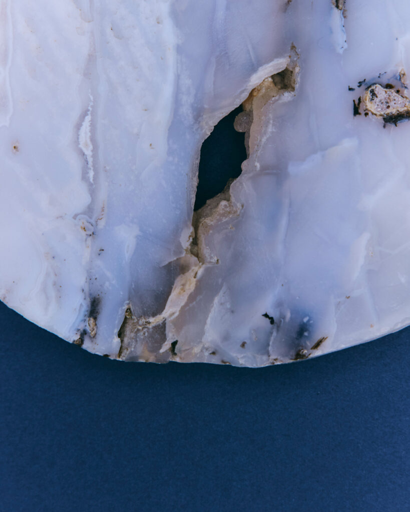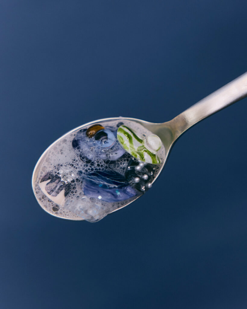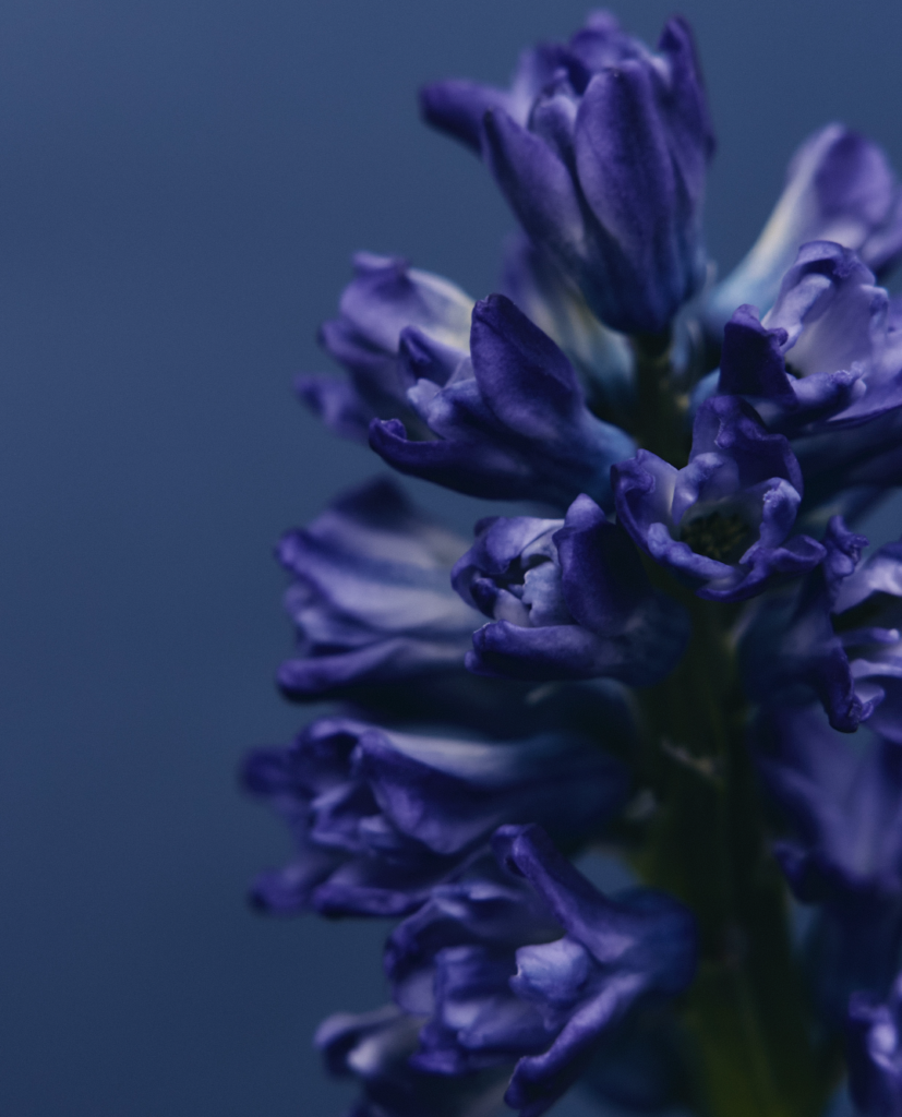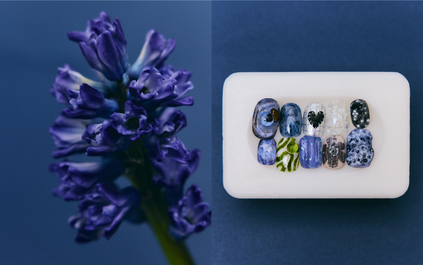 A1. 冷たい色のグラデーションとヒヤシンスの温かさを閉じ込めました。“変わらぬ愛”という花言葉の意味も込めて、抽象的なモチーフに加え私らしい立体感や曖昧さをアクセントにしています。