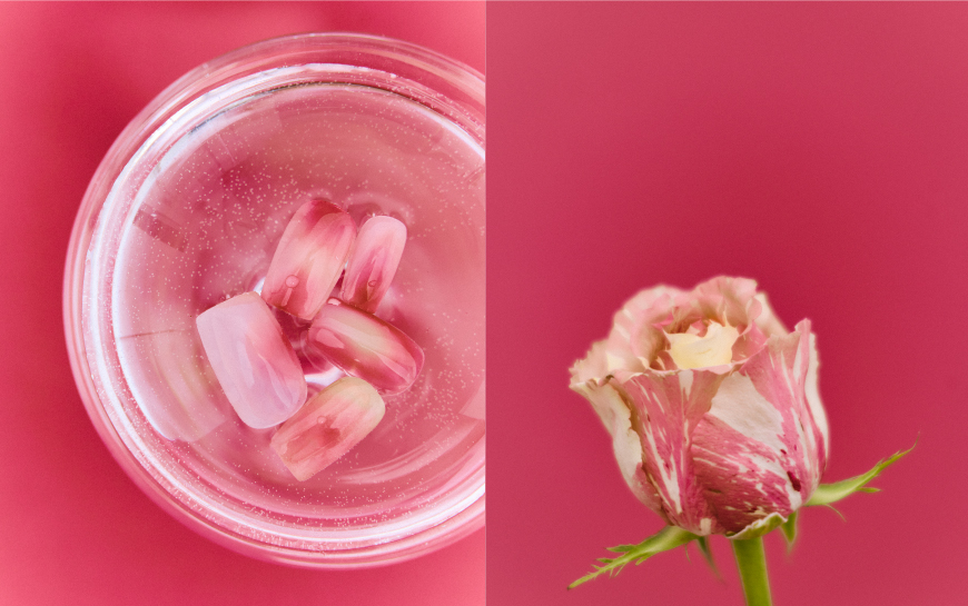 A1. 絞りバラのように、赤と白がにじむ色合いを表現。見入ってしまうほどに透明感のあるグラデーションで、花びらの何層にも重なる奥行きと、繊細でやわらかな華やぎを落とし込みました。