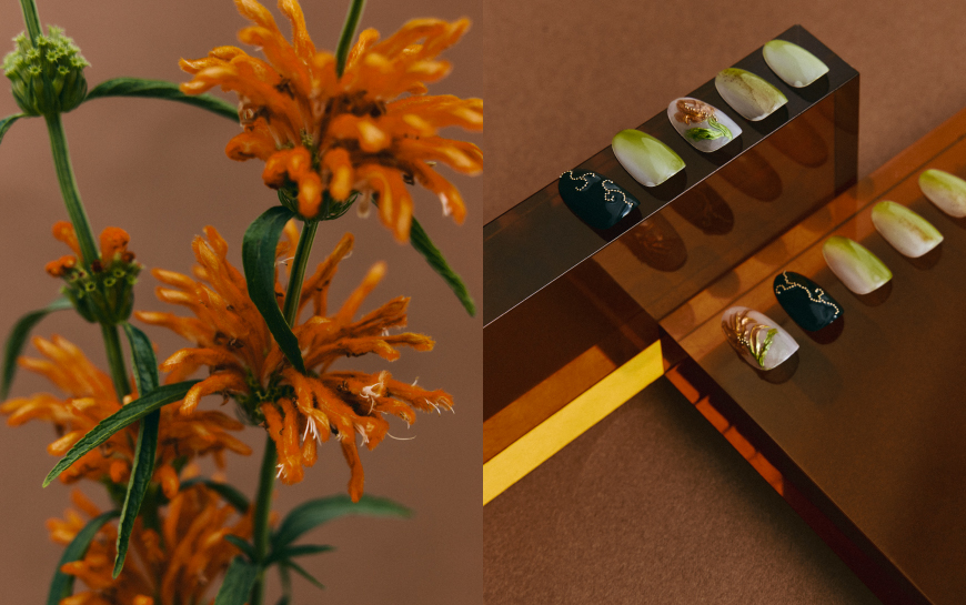 A1. オレンジのレオノティスをゴールド×カッパーで大人の配色にアレンジ。立体的な花弁や有機的ライン、くすみグリーンを重ね、自然の美しさを指先に落とし込んだアートネイルにしました。