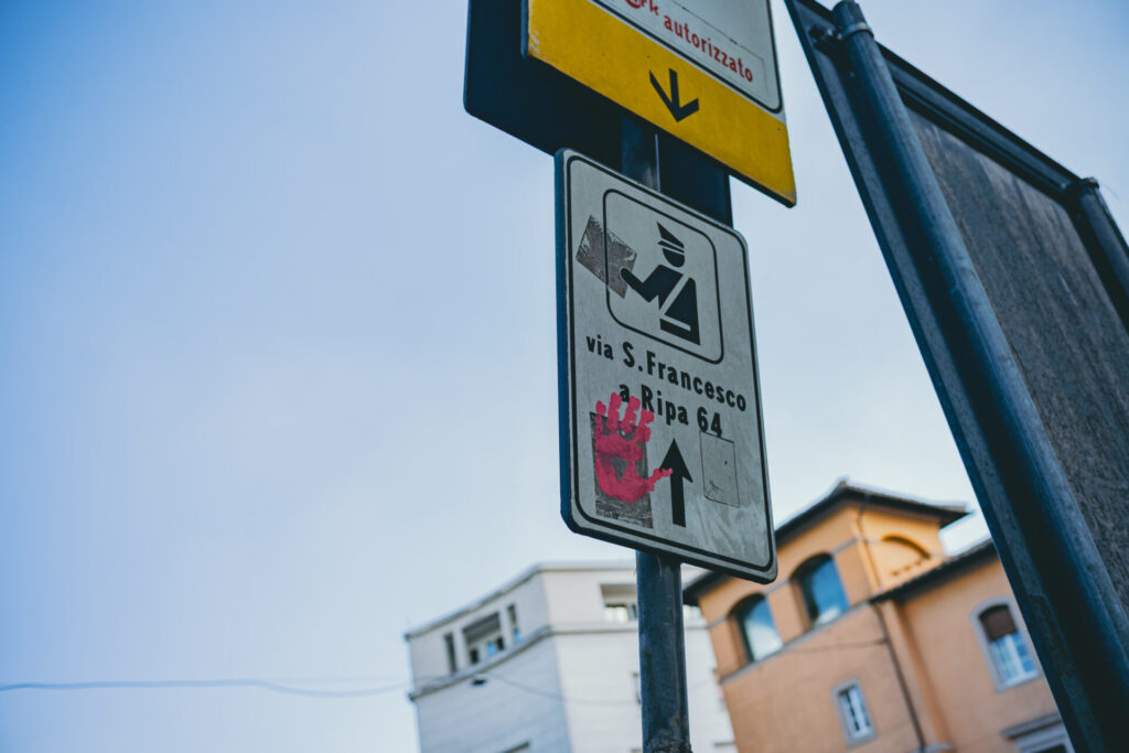 旅先で見つけた、青い空の下の、ピンク色の手形。強い力で押し当てて、ここにその跡をつけたのだろう。それは何かへの小さな抵抗のしるしなのか。それともただ存在の証明なのか。自分の手のひらと、当たり前だけれどちがう。