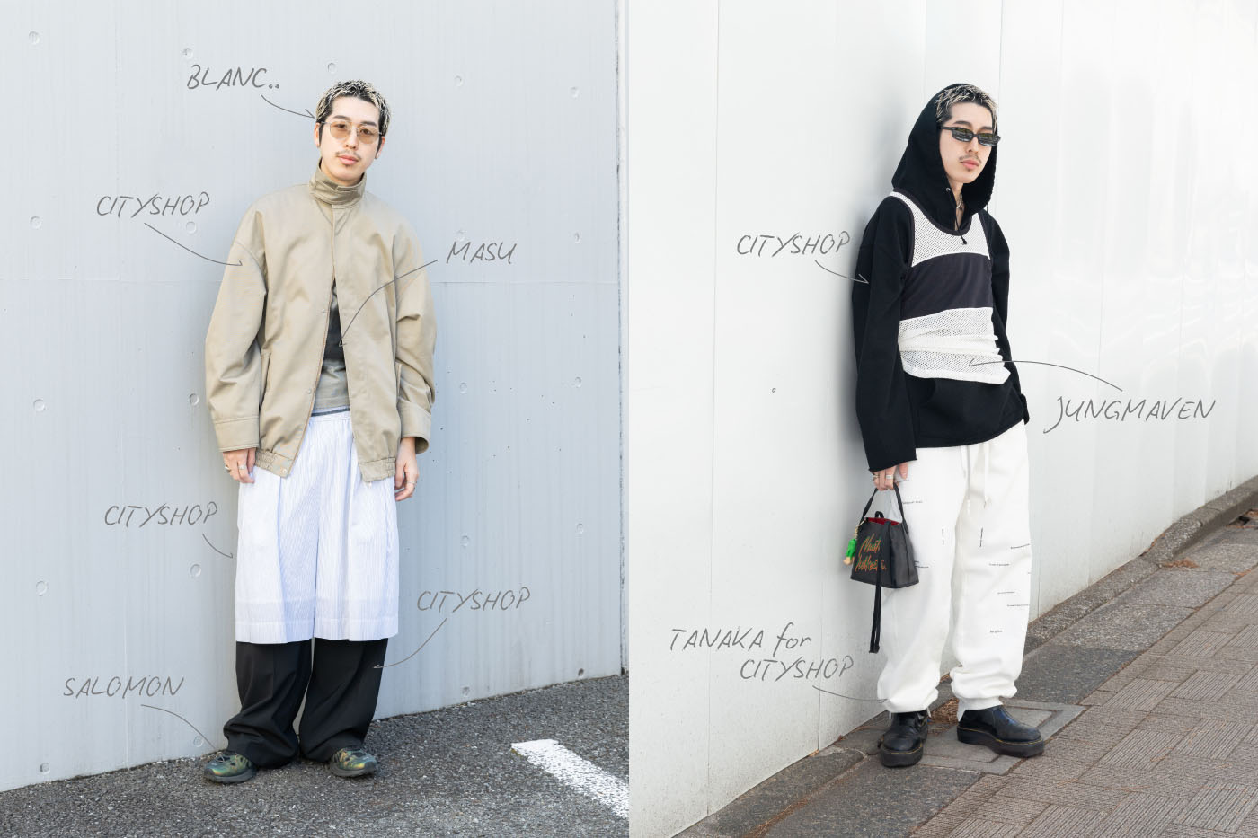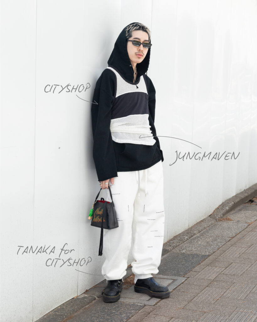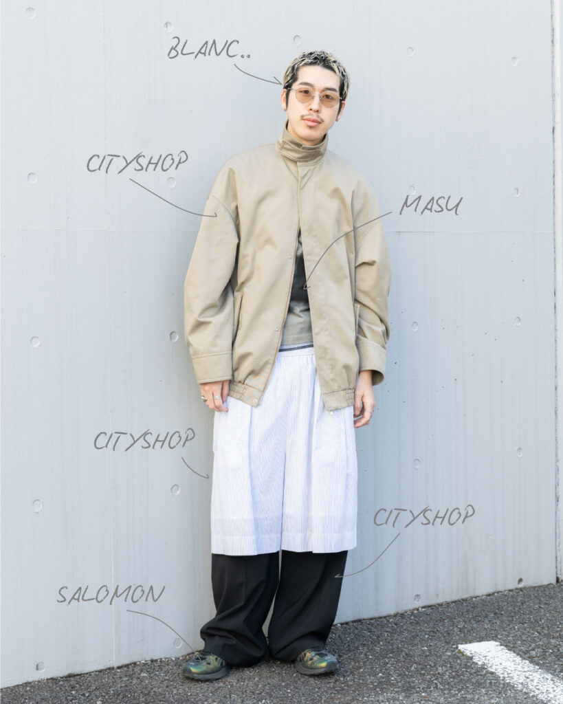 今回のスタイリングの軸になっているのはパンツのレイヤード。「自分の今の気分もそうですし、『シティショップ』が推しているムード」と話すように、お店の空気と自分の感覚をどうリンクさせるかが起点になっている。ベージュや黒、白といった落ち着いたトーンでまとめながら、丈やボリュームに微妙な差をつけることで、自然と視線が下がるように。「パンツを重ねばきしていると、街を歩いた時に“今日ちょっとイケてるかも”って思えるんです(笑)」。その高揚感は自分のテンションを上げることにもつながっている。ウィメンズも取り入れながら甘さに寄せずストリートでまとめる、そのバランス感覚が彼らしいモードの落とし込み方。