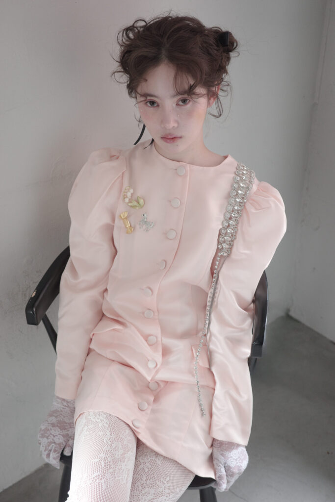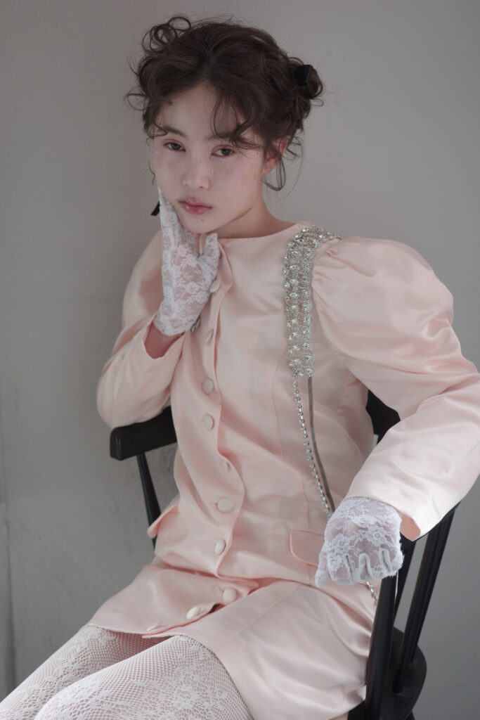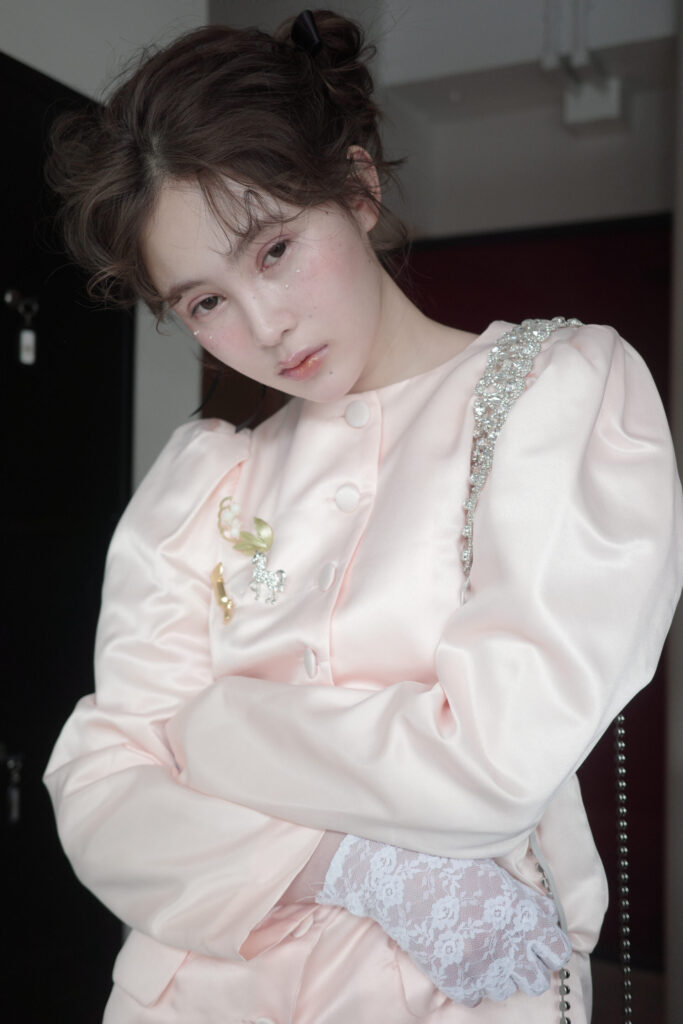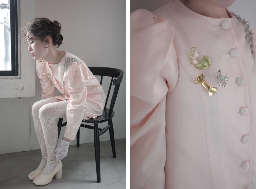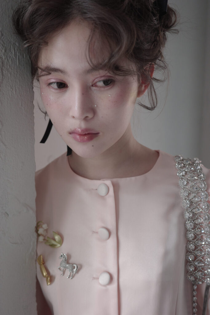 「ベビーピンクのドレスに一目惚れ。目にするまでは大人っぽいスタイルでイメージしていたけれど、自分がワクワクするのはこっちだなと確信し、こちらを選びました。ツヤ感のある素材で品のあるドレスをベースに、大きなビジューのアクセサリーでスパイスを入れつつ、ポニーやスズラン、キャンディなどのユニークなブローチで遊び心をプラスしました」。淡い色みで描いた一見ロマンチックな世界観は、印象の異なるきらめきでぐっと引き締めひと癖あるスタイルに。彩度を抑え洗練されたシックな写真の質感で、凛とした女性に落とし込んだ。