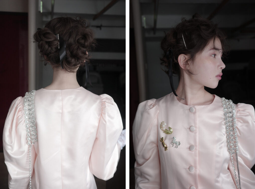 「ヘアは細めのコテでしっかりと巻いてから、適当なバランスでお団子を3つ。2つではなく3つがポイントで、リボンもしっかり結ぶのではなく垂らすようにサイドに加えて、衣装とリンクさせたビジューのピンでアクセントをつけました。“春のきらめきや高揚感”をキーワードに、サイズの異なるスパンコールとパールを目もとにちりばめ、繊細で儚い印象に。主張しすぎない透明感の出るピュアなピンクで血色感を加えたメイクアップに仕上げました」。