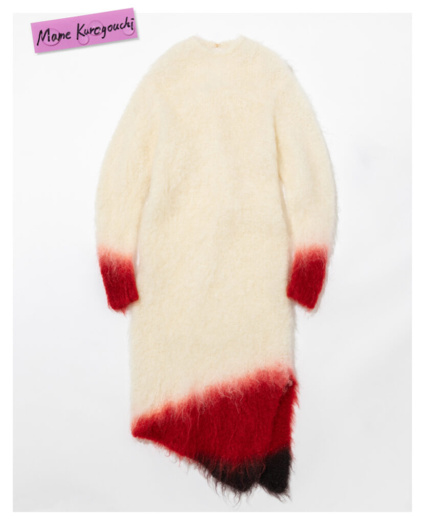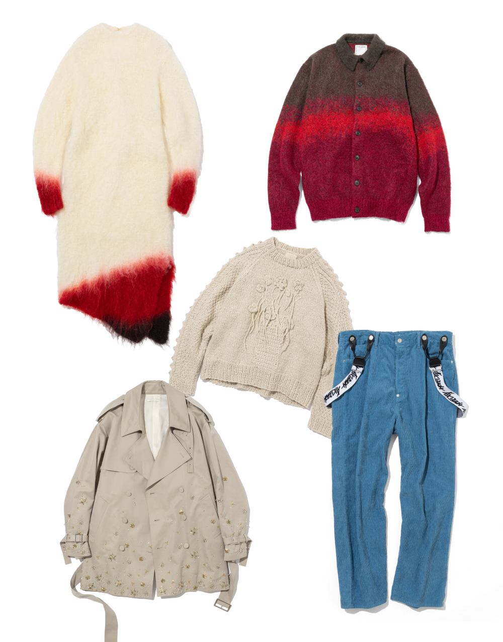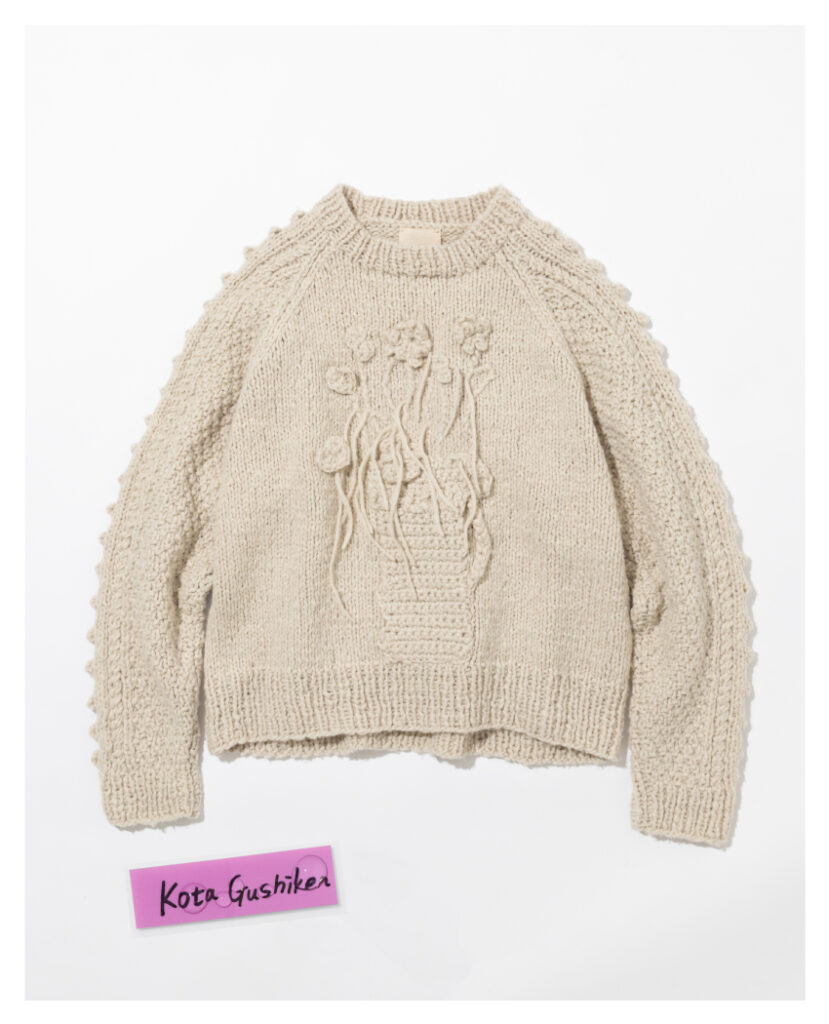 “Take knit easy”をコンセプトにジェンダーレスのニットウェアを展開する〈コウタ グシケン〉は、この秋は“愛とリスペクト”をシーズンテーマに。滑らかなタッチのカシミヤ混ウールを使用し、ピエール・ボナールの画集の花モチーフをかぎ編みで立体的にデザインしたハンドニットは、感触と視覚から愛を表現。茎は糸が表面から垂れていて、奥行きのある表情豊かな一着に。袖を通せば、着心地のよさと愛に満ちた丁寧なハンドワークに魅了されるはず。