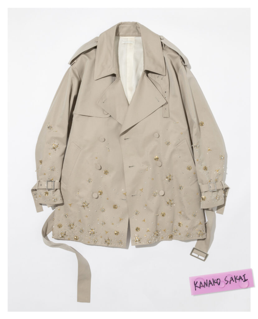日本的な美意識を感じさせるカッティングと、独特で多彩なムードを持つ素材選びに色づかいの組み合わせが特徴的な〈カナコ サカイ〉。今シーズンは“きれいなものをあえて壊す”という力強さを表現。一点一点、熟練職人の手作業で“温度に応じて形を変える雪の結晶”が刺繍されたトレンチコートは、本物の雪のように繊細で儚く煌めいている。メンズライクな大きめのサイズ感ゆえに、柔らかな素材のボトムスで可憐に着こなしたい。