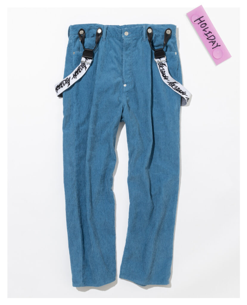 固定概念にとらわれずボーダーレスに、自由にファッションを楽しむことをコンセプトに“今のファッション”を提案する〈ホリデイ〉。リアルなヴィンテージ加工が施され、肌触りもよく艶感のある上品なコーデュロイパンツは、ワイドなシルエットでもハイウエストなデザインでボーイズすぎない程よいバランスに惹かれる。サスペンダーをラフに垂らせばアクセントにも。その日の気分に実直に、思いっきりプレイフルにはきこなして!