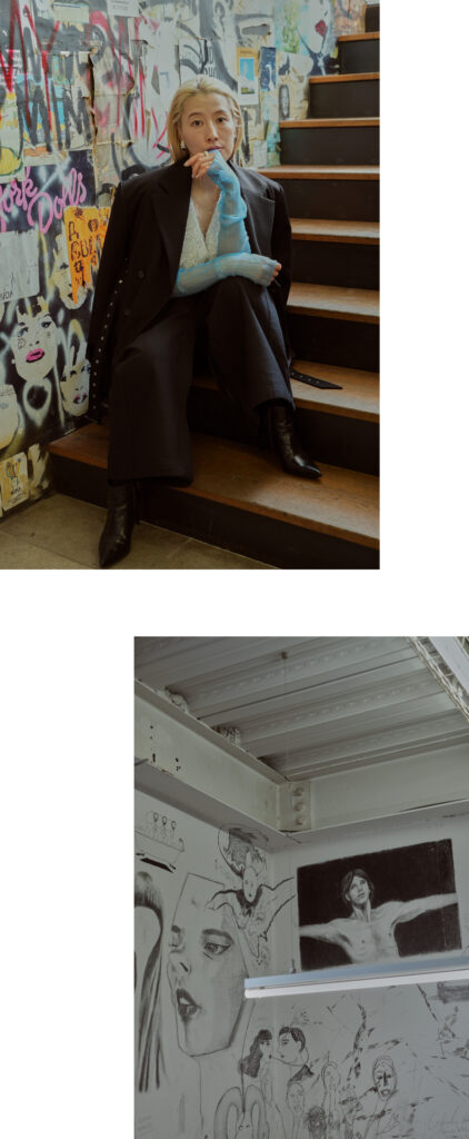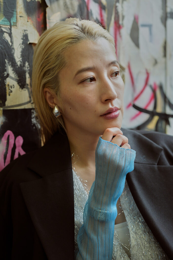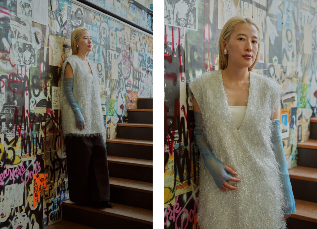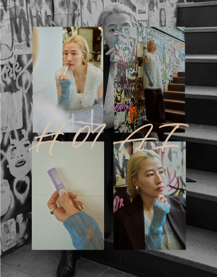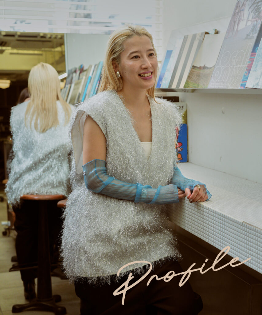「〈フミエ タナカ〉のキラキラのベストに、メイクと色みをリンクさせて〈ジェーンスミス〉の水色のレースアームウォーマーをセレクト。力強いイメージを持つ〈ファックス コピー エクスプレス〉の変形スラックスに、〈バレンシアガ〉のポインテッドトゥのヒールを合わせました」。肌見せのバランスといい、異素材の組み合わせといい、ハイレベルなスタイリングを提案してくれた。「最初は仕事と育児のバランスを保つのが難しく、周りに助けてもらいなんとか両立。どんな時でもお客様の前では表現者として力強くありたいし、子供の前では母親という使命を背負いながらも、尊い存在として自分のペースで自分らしく務めたいと思っています。その姿が優美かなって感じます」とAIさん。この日のメイクやスタイリングからは彼女の個性はもちろん、考え方や生き様をありありと感じ取ることができた。