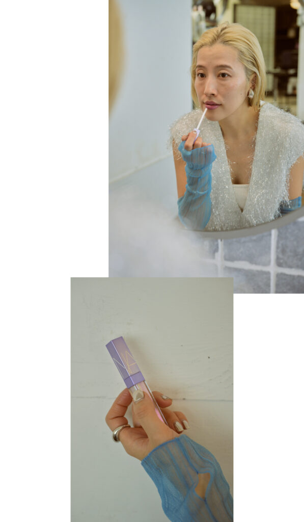 “RUGGED”の荒々しさをハンサムな雰囲気を醸し出すオールバックヘアで、“GRACE”の優美さを艶感ときらめきをポイントにしたメイクで演出。「優美さは抜け感や艶っぽさで表現できるかなと思い、ライラックのハイライトを目元に置いて冷静さを。カラーアイテムというよりかは質感を重視して、やや青みのある艶が出るリップグロスを主役にメイクしました」。品のある繊細なきらめきにグッと引き込まれる……。自然と視線が口元にいってしまう、魅惑的なアイテムをチョイスしてくれた。