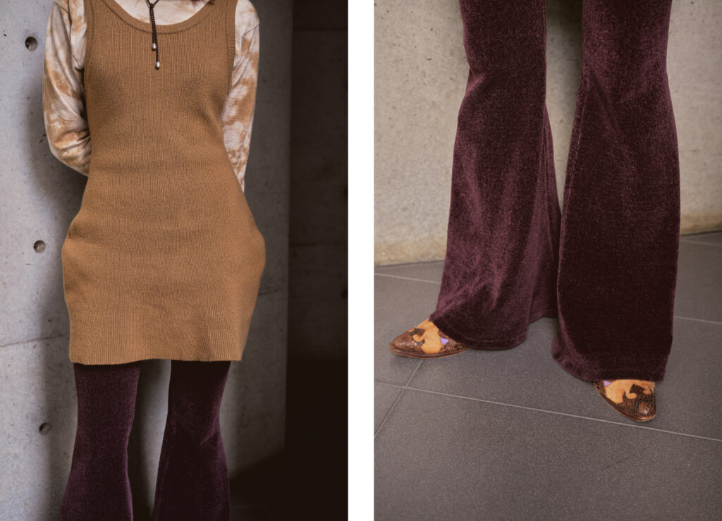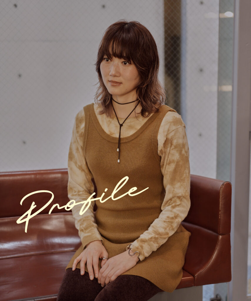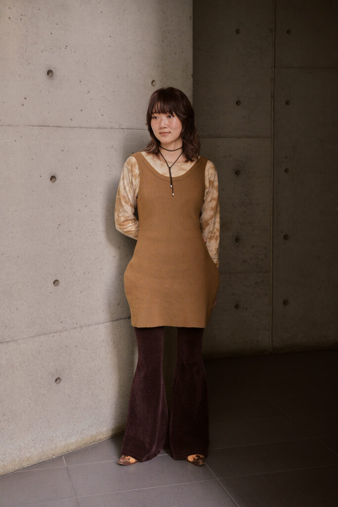 「普段フェミニンな要素を取り入れることが多いので、女性らしいしなやかなシルエットが出るアイテムを選びました。腰周りをぷっくり誇張させたニットドレスと、裾にかけて緩やかに広がるニットパンツはどちらも〈ミディアム〉。赤みや黄みのブラウンをレイヤードし、ワントーンながらも奥行きのあるスタイルに。ヴィンテージショップ『オトエ』でひと目惚れしたウエスタンブーツは、サイズもシンデレラフィット。流れるようなシルエットに、足元はレザーでささやかなスパイスをプラス。“RUGGED GRACE”は、いろんなヘアスタイルを提案するという面で、お客さんに寄り添いながらも大胆なアイデア発信するという仕事のスタイルが、自分を表す言葉でもあるかも」。穏やかな表情の奥に感じる真のある眼差しや自身の信念を貫く強さは、まさに“RUGGED GRACE”を体現しているよう。
