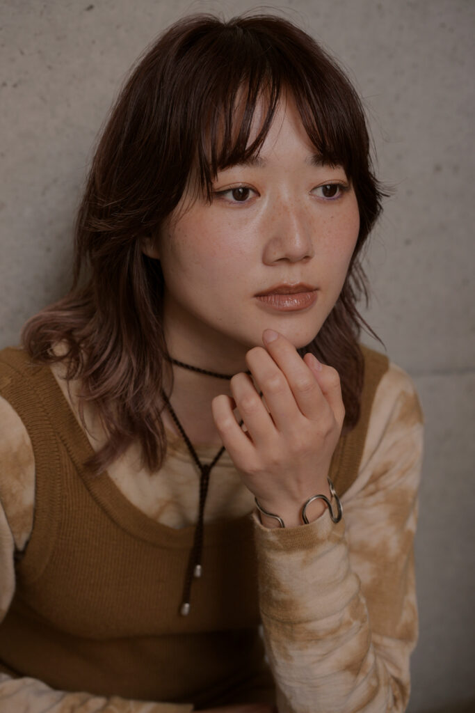 ブラウンベースにさりげない青みを加えて、やわらかさをピリッと締めるメイクを提案。「そばかすを消さずに活かすことがポイント。欧米人の肌質が好きで、ファンデーションはせずに下地のみ。下まぶたのインラインにはライラックのシャドウを。チークにも青みブラウンをのせました」。“女性らしいくすみ”をキーワードに、ただぼやかすだけではなく色みを入れるパーツにアクセントを置くことでニュアンスを引き出している。ナチュラルでマットな青みカラーで輪郭が描かれた、凛とした女性像を感じさせるメイク。