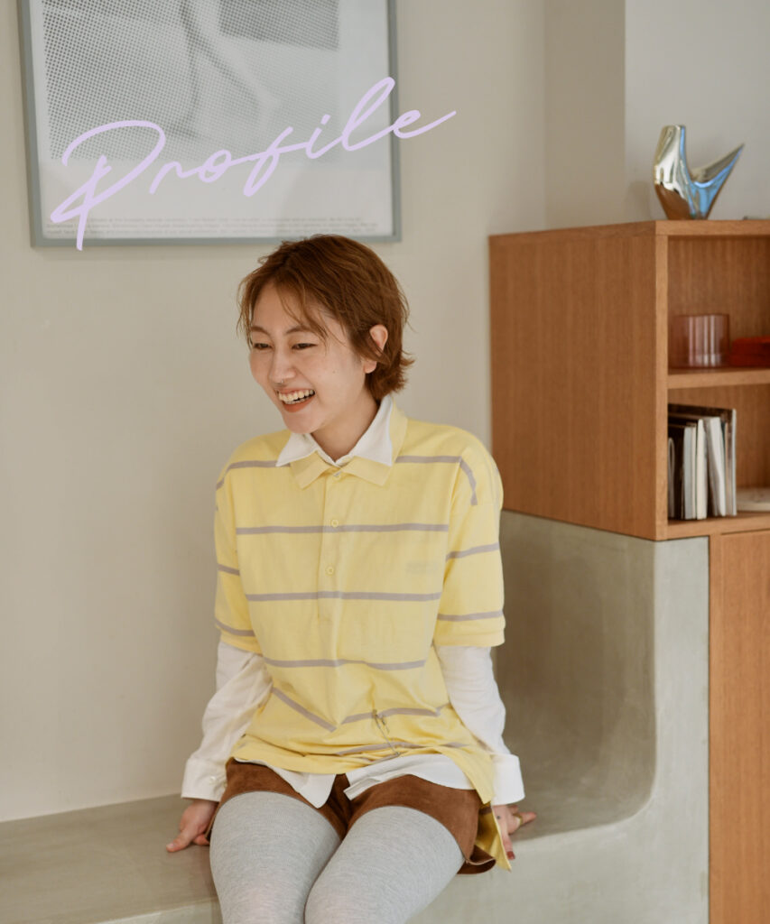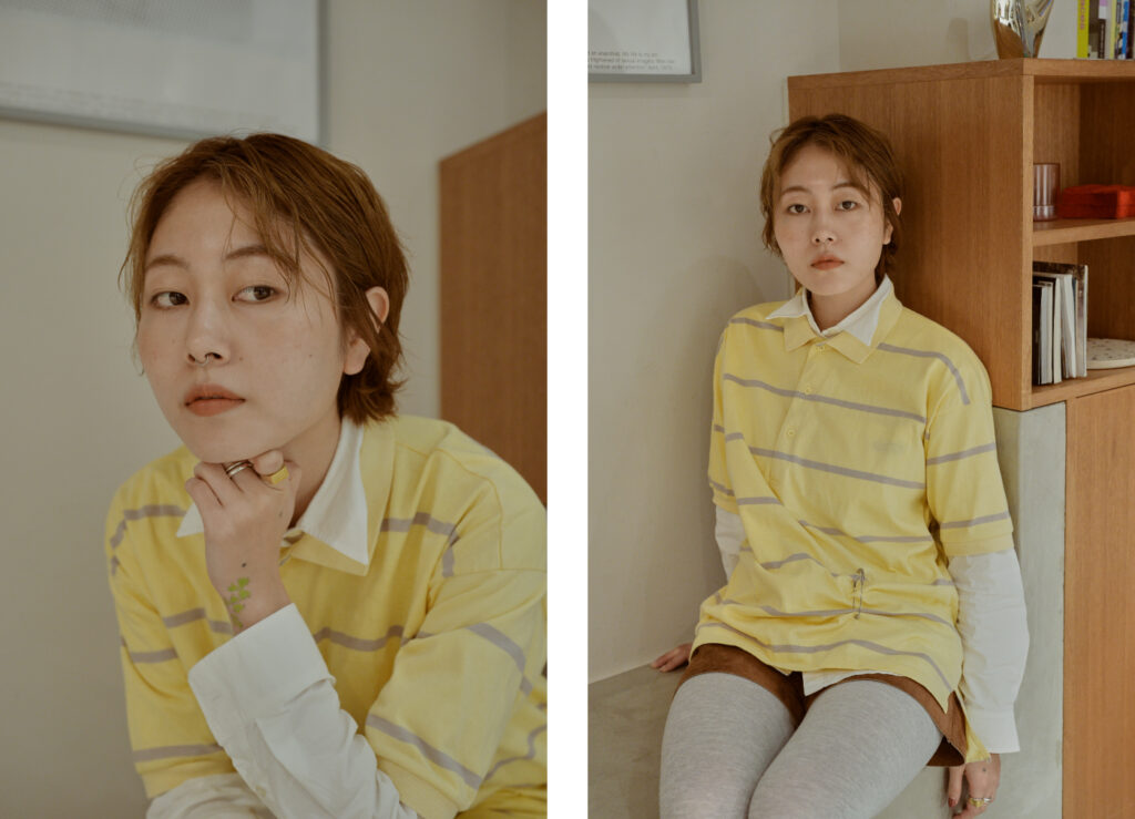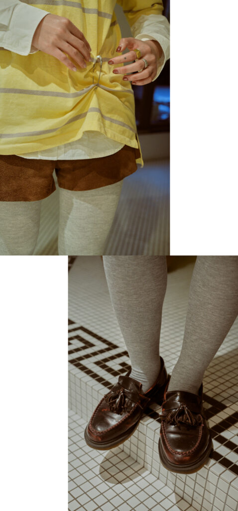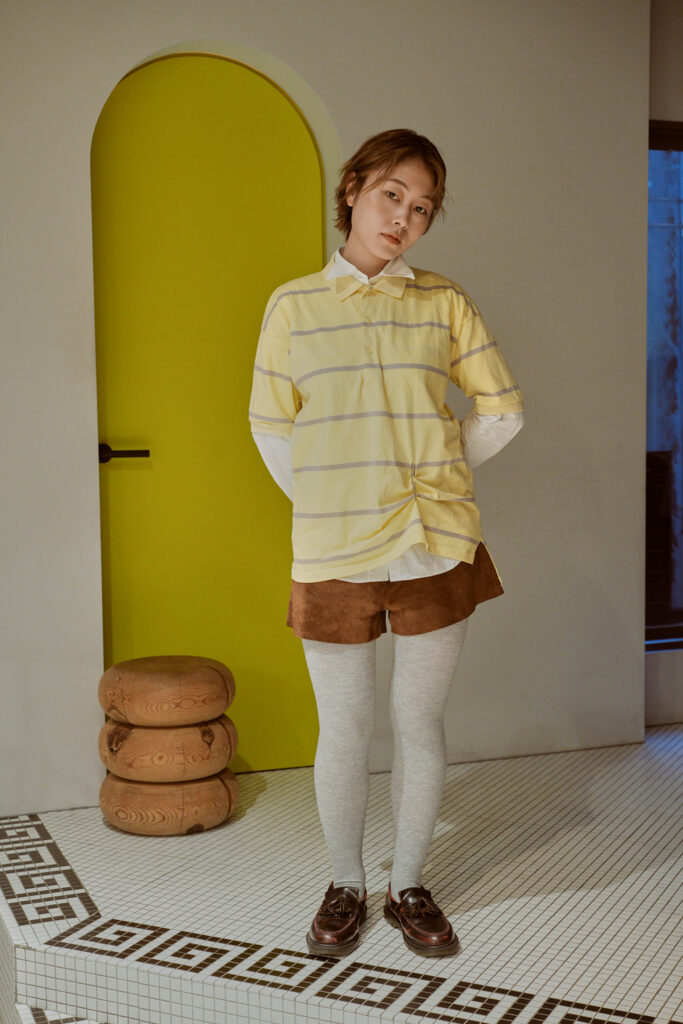 「ミニ丈のボトムにタイツスタイルが私のアイコンなので、ベースは崩さずに。夏にヘビロテしていたヴィンテージの黄色のボーダーポロに、ギフトでいただいた〈ミュウミュウ〉の白シャツを合わせてダブルカラーにしたのがポイント。オーバーサイズのトップスは〈バーバリー〉のピンでメリハリを。足元は〈ドクターマーチン〉のブラウンローファーで、クラシカルな雰囲気をプラスしました。私は喜怒哀楽が強く、感情表現が豊か。それはピュアな人間とも言えるし、その時々の気持ちを素直に受け入れることを大事にしています。自分を表現する行為って美しいし、優美だなと思います」。自分らしくいることこそが、“RUGGED GRACE”であると考える彼女は、独自のスタイルを確立していることを物語っている。