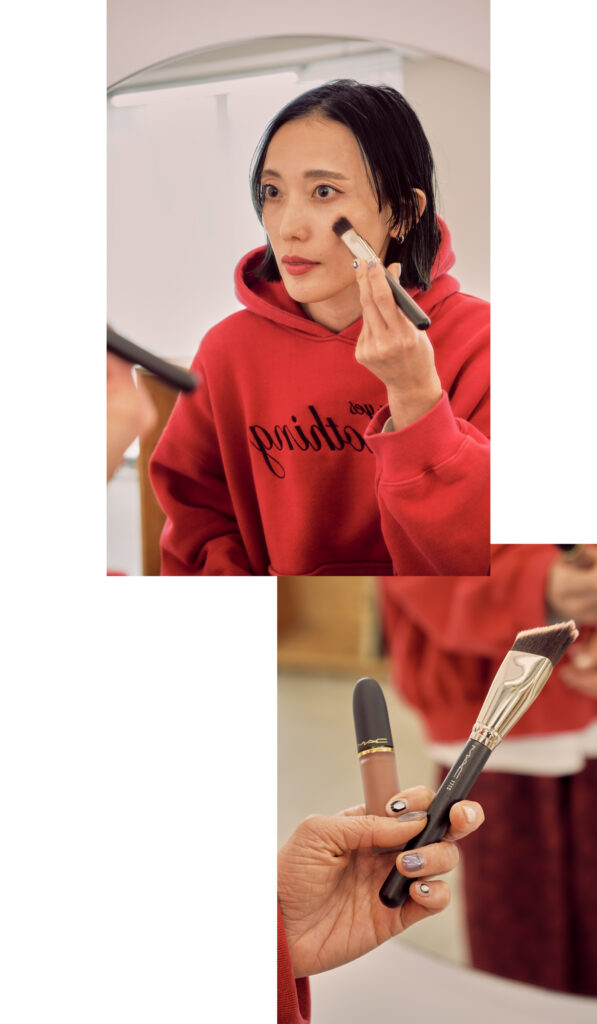 「もともとは目元、眉毛などのポイントをしっかりメイクするのが気分でしたが、今はお肌がきれいに見えることを重点に置いています。素肌感にツヤをプラスするベースメイクが好きです。自分の肌に合うアイテムを追求し、全体的にナチュラルに仕上げるようにしています。削ぎ落とすだけだと物足りないので、最近はチークにポイントを。チーク用のブラシで自然な赤みを乗せています。このブラシとムースチークが本当にお気に入り。リップは濃い色がしっくりくるし、自分のトレードマークでもあります」。顔の印象を一気にドレスアップするムースの質感が、ふわっと自然体ながらもやさしく主張しているのが特徴的。赤のリップで凛とした印象が加わった大人モードなメイク、憧れます!