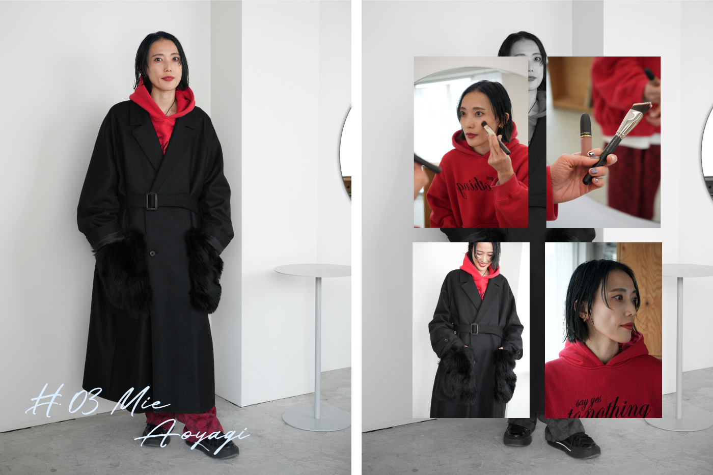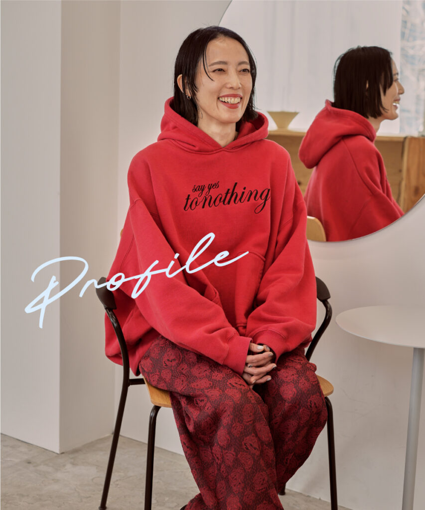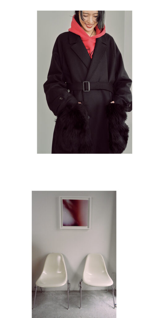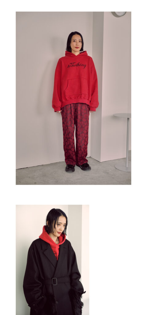 「普段は白や黒など無意識にモノトーンが多くなるけど、今日は気分が高揚する大好きな赤をチョイス。赤は本能的に惹かれる色で、友人のブランド〈セレナヘリオス〉のフーディに〈フミエタナカ〉の花柄のパンツを合わせました。大きなファーのポケットがポイントのコートは〈シュタイン〉。フーディもコートもオーバーサイズを選んで、自分を包み込んでいる感覚を“Wrapping Style”として表現しました」。美術や芸術が好きで、つい最近はアート展のために高松まで足を伸ばしたそう。きれいなものを見ることが癒しであり、自分への小さなご褒美でもある。「本も同様に美しい言葉を知れたり吸収できたりするので、インプットのツールの一つ」と話す。好きな赤で包み込むファッションが、きれいなものや言葉に触れ心を包まれる姿とリンクしているように感じた。